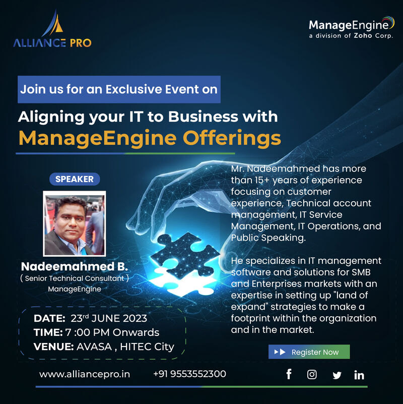 Alliance Pro IT proudly announced an exclusive event in collaboration with ManageEngine, a division of Zoho Corporation. This event is designed to bring together professionals, industry experts, and technology leaders from diverse sectors to foster meaningful connections, exchange insights, and explore emerging opportunities in IT and cybersecurity.